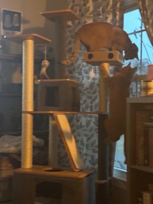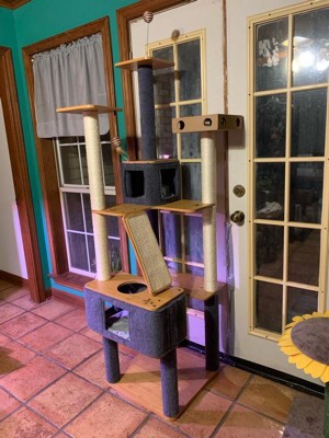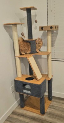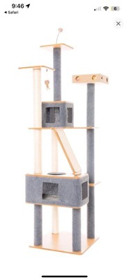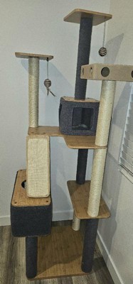[This review was collected as part of a promotion.] This cat tee is amazing. It has everything any cat would like and need for play, exploring, and sleeping. It comes with 3 separate attached toys, a scratch pad, and two cubbies. It’s very sturdy and well made of heavy wood and nice carpet. It has multiple scratch posts and a detachable scratch pad. It’s tall but doesn’t take up a lot of space in your room. My cat loves this cat tower, he especially loves the wooden box with the jingle cat spheres. This is a 10 out of 10 I definitely do recommend.