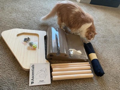 Watch your cat cozy up in their own Chalet! This wide and sloped scratcher features interactive catnip and jingle toys and a nook with a pillowed hammock to create a cozy hideaway. Combining functionality with a modern and durable plywood aesthetic, the scratcher material is made from recycled and replaceable corrugated cardboard to help promote healthy claw behavior. Quickly assemble the scratcher with our step-by-step instructions and diagrams, and scan the included QR code to watch a guided instructional video for a helping paw. Ascentials by FurHaven is inspired by nature and designed for your home. The Chalet is styled to feel natural in any room as your cats create their own safe, exciting, and cozy environment.