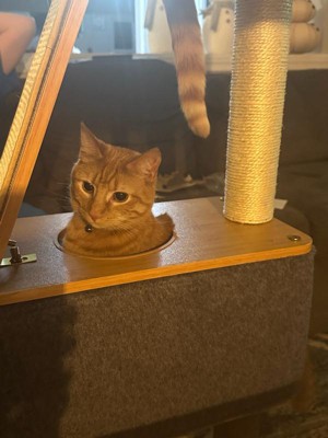 [This review was collected as part of a promotion.] This cat tree looks so nice. I love the neutral coloring. It made it very easy to blend in and match the rest of my furniture. This is very sturdy. Even with my cats jumping up to the higher shelves it stayed in place. The cats loved the scratchers and little cubby holes. They really liked the hanging balls as well but unfortunately after playing with it for a few minutes he was able to rip the ball completely off. I do wish the top cubby was a bit bigger as well. My cat is on the smaller side and as you can see he barely fits in there. It didnt stop him tho. Overall this is a great cat tree.