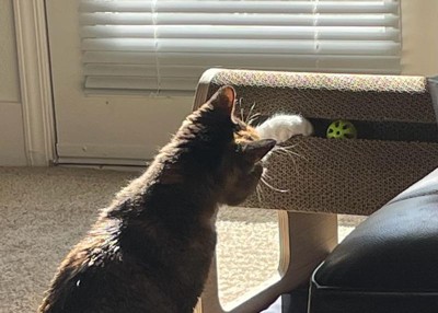 [This review was collected as part of a promotion.] My cat loves his Multipurpose Cat Chalet Angled Scratching House. I will often hear him clawing at it and trying to attack the balls at all hours of the night. I’ve had it for several weeks now, and the cat chalet seems very durable. I like that the recycled cardboard is replaceable as I can see him going through it quickly, and I really like that this chalet is multipurpose—as it’s a hammock, scratcher, and toys—which is very space efficient for me. He will sleep in it during the day sometimes, and the design is stylish enough that I can put it in any room of my house.