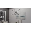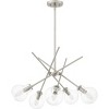 Bold lines and glass orbs create a modern, futuristic look in Asha. The sputnik-inspired chandelier comes in brushed nickel and features open, clear glass globes for a playful lighting effect. With a fun and geometric design, Asha makes an eye-catching statement over a kitchen island, table, or in a living room.