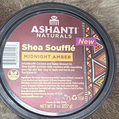 Ashanti Naturals Shea Soufflé Midnight Amber 8 oz - Our 100% pure unrefined Shea Butter is extracted from the seed of the West African Karite Tree, known as the Tree of Life. This rare, natural butter has been treasured for centuries as it contains essential nutrients to heal, moisturize and protect all types of skin while restoring elasticity and tone. Rich and creamy, each jar of our soufflé Shea Butter is cold pressed and hand filled with care to give it it's soufflé like feel.
