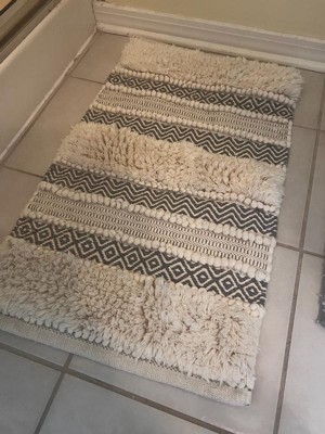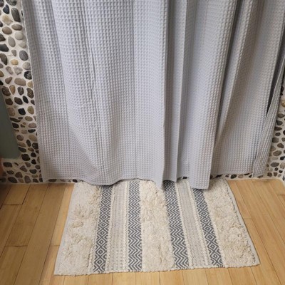 Globally inspired with an artisan touch, the INK+IVY Asher Woven Texture Stripe Bath Rug is the perfect update to refresh your bathroom decor. This hand-woven bath rug features a combination of beautiful patterns, shaggy textures, and fabric techniques in a vertical stripe layout, for a stylish Boho look and feel. The shaggy woven texture is featured in a solid light light natural hue, which alternates between a gray geo pattern and fabric manipulation technique to create soft dimension and a unique design. Machine washable for easy care; this rug is also finished with a Non-skid resistance latex backing to help keep the rug in place throughout the day. Complete the look of this New INK+IVY bath rug collection with any of our coordinating INK+IVY Shower Curtain, Bedding, and Window Collections, available and sold separately.