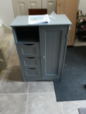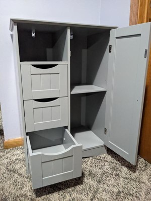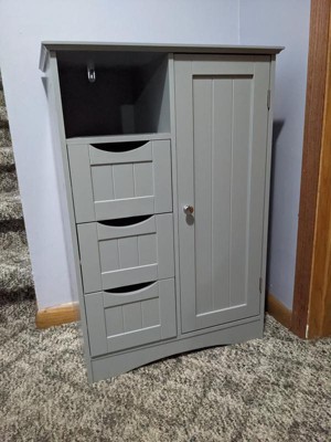 Our Ashland 1-Door, 3-Drawer Floor Cabinet is a versatile storage solution for small spaces. It seamlessly blends into any room, be it a bathroom, bedroom, entryway, or hallway. Its beadboard styling and mirrored door knob add a touch of elegance, while the durable painted MDF construction ensures durability. Declutter your living space with our bathroom cabinet organizer. The three drawers provide storage for towels, toiletries, and other essentials, while the adjustable shelf and open cubby offer flexibility. Say goodbye to cluttered countertops and embrace a neat, streamlined space. Anchoring the Ashland 1-Door, 3-Drawer Floor Cabinet to the wall ensures unwavering stability, even in high traffic areas. Assembly is a breeze with the included detailed instructions, allowing you to enjoy your new storage solution in no time. Whether you're seeking bathroom floor storage, a small kitchen cabinet, or a versatile bedroom cabinet, this white cabinet with a door is the ideal choice.
