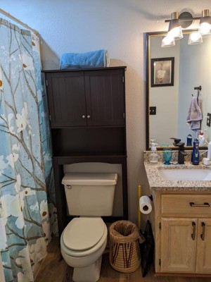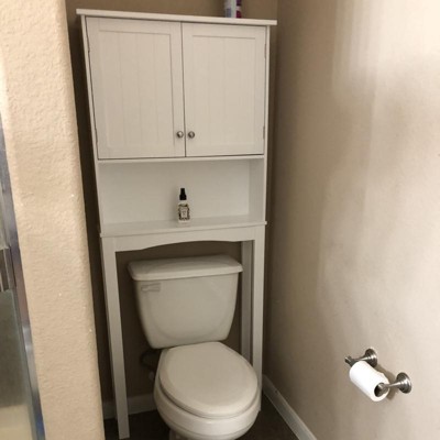 The master bathroom in my new house is very small. I had to put most of my bathroom products in the guest bath. This cabinet solves my problem. It fits perfectly around the toilet and just between the shower and sink. There are 2 shelves behind the doors and a third below the doors which holds everything I need. Besides being very functional, it looks great. I couldn't be happier with this product. One suggestion, I had to attach the lower cross bar after placing the cabinet around the toilet because it didn't fit behind the toilet. I would check that before attaching the cross bar when assembling the unit. Otherwise this is a great product that looks great in my bathroom. I would recommend it to anyone.