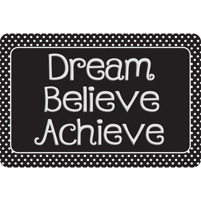 Ashley Productions® The Original Fun Mat™, Mat Runner, 15.5" x 47", Dream Believe, Achieve, Black with White Dots | Transform your classroom, home, or office with our vibrant decorative floor mats! Designed to inspire and engage, these eye-catching mats are perfect for creating a welcoming and dynamic learning environment. Featuring a soft, absorbent surface that's easy to clean and a heavy-duty, slip-resistant rubber backing for added safety, they're built to handle the demands of high-traffic areas. With a variety of educational, nature-inspired, and interactive designs to choose from, our mats are ideal for cozy reading corners, designated learning zones, or simply adding personality to your space. Brighten your room with a burst of color and creativity while providing a comfortable, inviting area for students or colleagues to gather. Mat Runner measures 15.5" x 47".