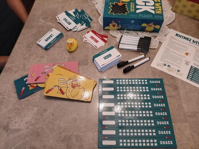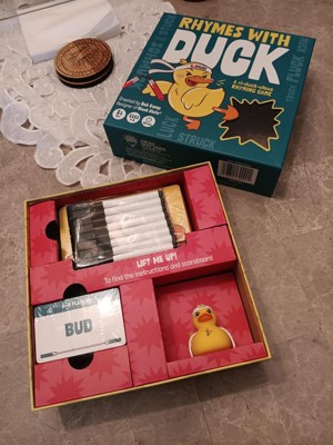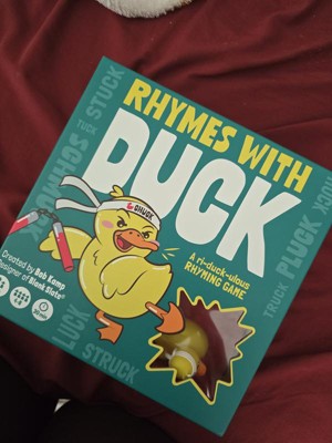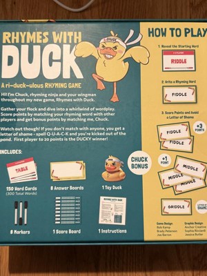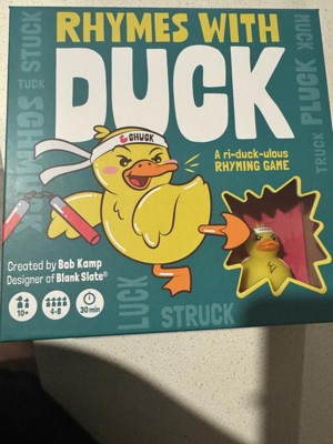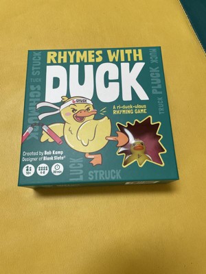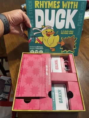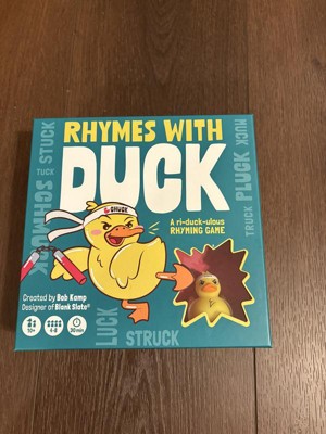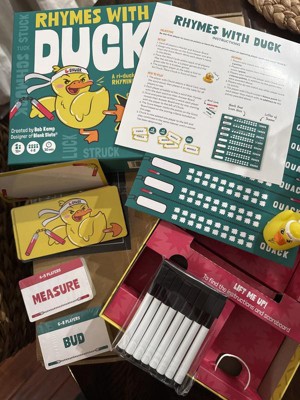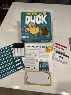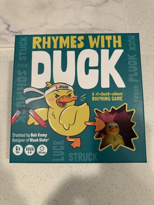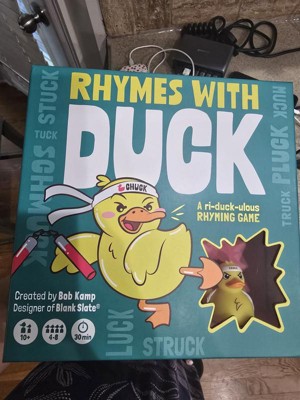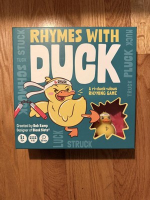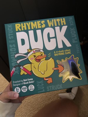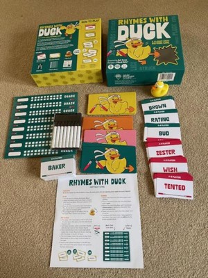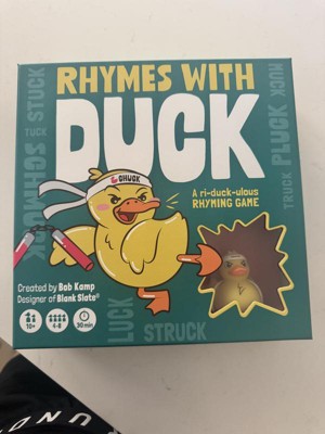 I received the Rhymes with Duck game and am impressed. The game is well made, doesn’t seem cheap. Comes with a cute lil duck named Chuck and everything you need to play. Fun game for kids and/or adults! It has cards for 4-5 or 6-8 players.