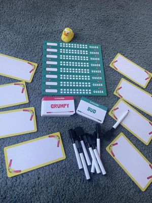 Perfect game for game night with the friends. Hours of fun. Ages 10 plus. Any where from 4 to 8 people can play. Comes with 8 dry ease markers and 8 boards to write your answer. A added plus is the rubber duck that comes with the game. Chuck is super cute.