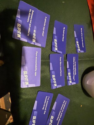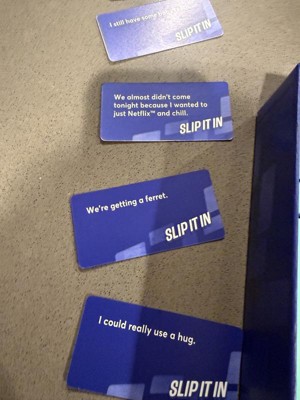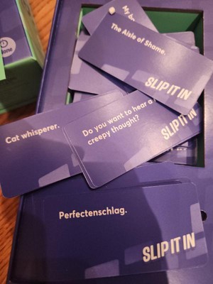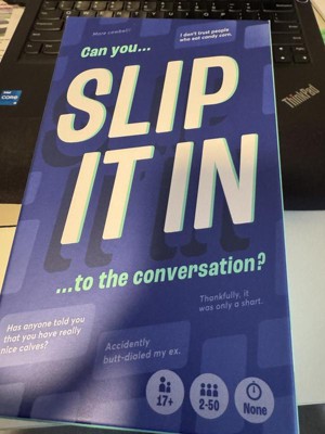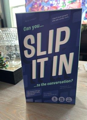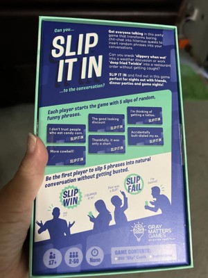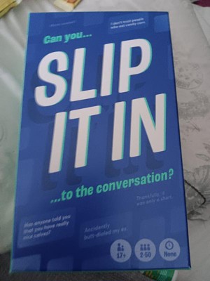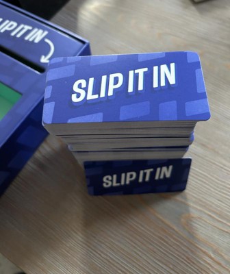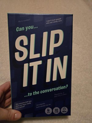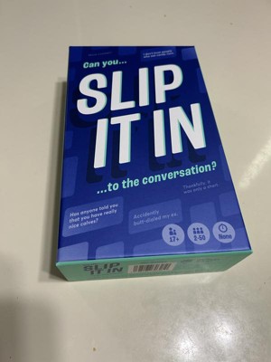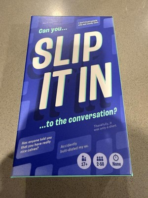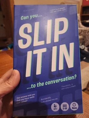 SLIP IT IN was played by me and my family during the holidays for a short amount of time... for whatbi underwtand is you pick a card and each person has to try and slip in what their card says into the convo without being caught. Which is a bit harder then you think when people know that random things are on the cards. I admit it was fun in the beginning, then started to get a bit boring. If you are a fan of these type of games this could be for you. I may give it another try but i dont think its a bad game.