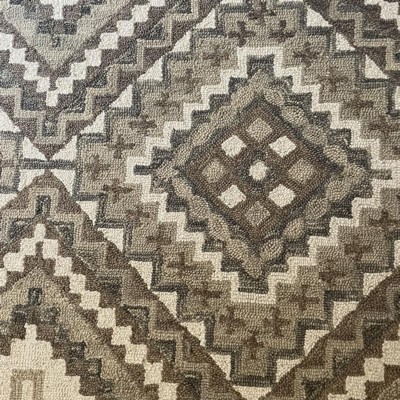 This rug is primarily dark brown and green with a hint of cream. It is way busier in person and with the colors has a traditional feel. It’s a pretty good thickness, not too thick or thin but it is scratchy wool. Kneeling on it hurt my knees. Returned because it was too dark and too busy. A beautiful rug of good quality just a completely different style than mine.