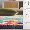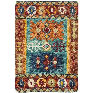 The rug's design features a striking combination of blue and red hues, beautifully interwoven to create a captivating pattern that draws inspiration from timeless motifs. The central panel showcases a deep blue background adorned with symmetrical red and white diamond shapes, offering a bold contrast that commands attention. Surrounding this, intricate borders with splashes of orange, yellow, and green add layers of color and complexity to the overall design.