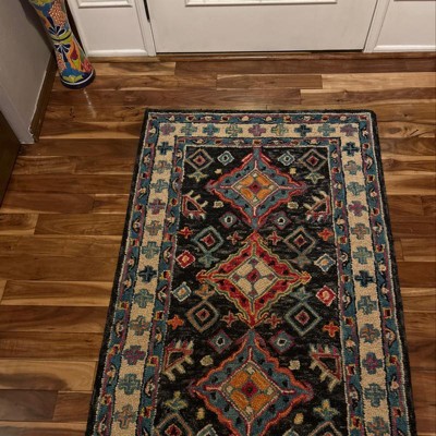 Beautiful rug with vibrant colors that works with my blue edged pottery and wood floor. However highly recommend getting a rug pad since it will slide around without.