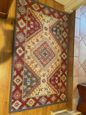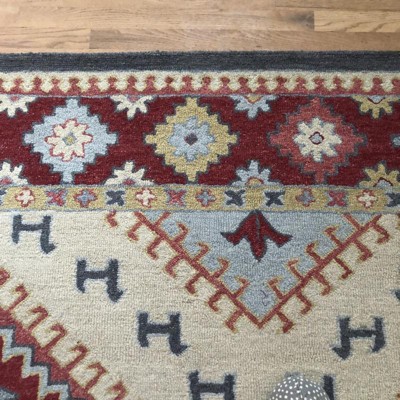 I love the neutral colors in this rug combined with a cranberry red that adds a pop of color. The rug is soft under your feet and it’s well made with nice tight loops. It looks and feels more expensive than it is. I have light beige walls with natural wood floors and the rug gives me a perfect pop of color that is not too loud. I have a charcoal gray couch and I was afraid the border of this rug was a brown grey, but it is a perfect medium grey color. I love it.