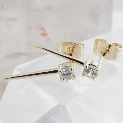 Take your ear stack up a notch with these versatile bar studs that are dotted with the tiniest crystal. Wear them bar side down or alongside your ear as crawlers. A chic, versatile piece that mixes and matches with everything. Measures 15mm long with a 3mm crystal.