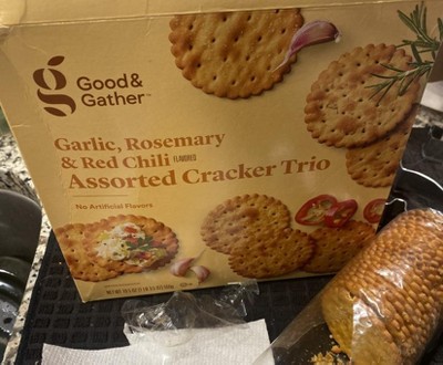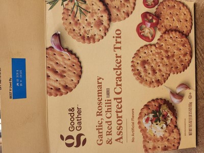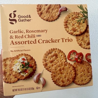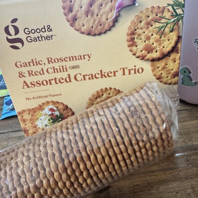 This Assorted Cracker Trio from Good & Gather™ makes a winning addition to any appetizer spread. This scalloped cracker trio features three varieties — garlic, rosemary and red chili flavored — for a deliciously elevated twist. Great for serving with cheeses, cured meats and spreads, these crackers are kosher and have no artificial flavors.