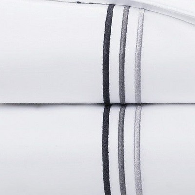 - THOUGHTFUL DETAILS: This collection features pure white sheets with contrasting embroidered border details – three shades of fine embroidered stripes in shades of lapis blue, fawn beige, dove white, onyx black, and stone grey. The set includes one fitted sheet, one flat sheet, and two pillowcases with a stylish envelope closure.