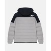 The flat black tech fabric on the hood and front panel, along with practical flap pockets on the chest, creates a contemporary and functional look. Quilted padded sleeves and back in a light grey contrast make this garment unique.