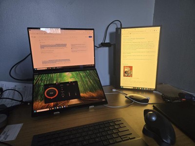A bit of a disappointment. Frist the positive, I love the double screen and the OLED. Now the negative. When connected to a docking station with 3 HDMI ports it will not keep them as set. It takes restarting the laptop and removing the docking station a couple of time for it to detect the additional monitors. Also, it seems to be limited to only showing 4 total monitors A 5th will be detected but unusable This will last for about 24 hours then you have to do it again. Biggest issue I work with spreadsheet all day long and the computer is very sluggish and freezes constantly. You have to wait for it to catch up. The external mouse does the same thing. The keyboard mouse does work well. I have 32 GB of ram 64-bit system it doesn't seem to have the horsepower.