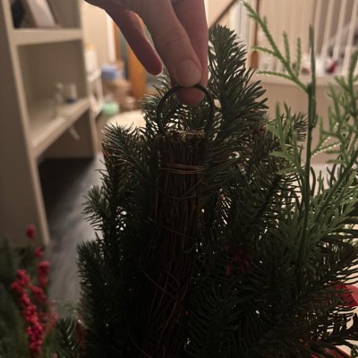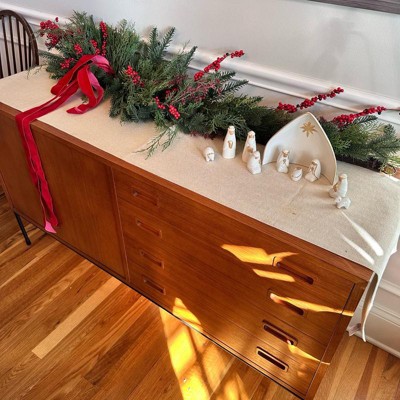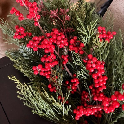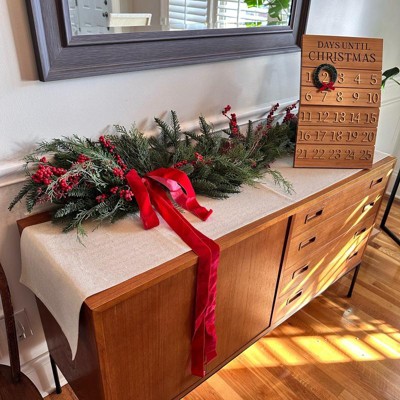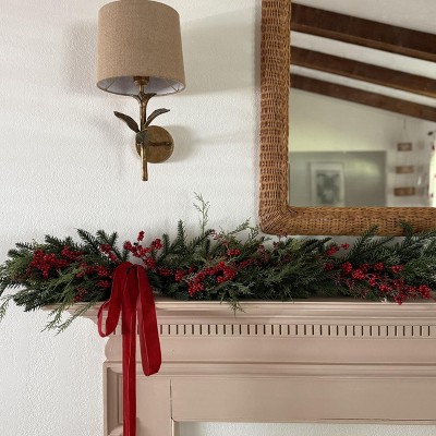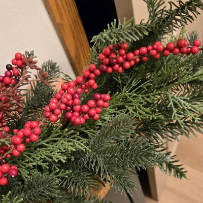 Finish off your holiday decor with this Asymmetrical Berry Pine Garland from Threshold™. Designed in an asymmetrical shape, this holiday garland features faux pine needles and red berries for a nature-inspired look, and it's accentuated by a red bow for festive charm. Suitable for indoor use only, you can hang it above the mantel or along walls or windows.