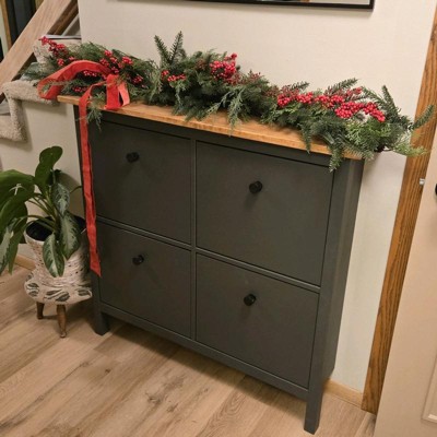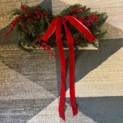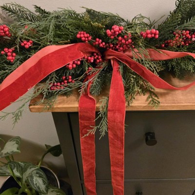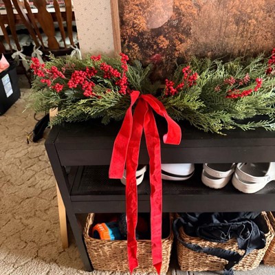 [This review was collected as part of a promotion.] While purchasing. I assumed this would be a piece you could hang up, but after unboxing I then saw that this was more just a garland (rather than what the first photo on the listing shows). I had the perfect place for this item and I’m tickled it worked out so well. I love the thin but long red velvet bow as it creates such a statement. I styled this on my entry way table since it’s too short to cover a full mantle. Overall the quality is great. My kids however have quickly decided to play with the berries and they are painted styrofoam. I had a piece of the pine that fell off, but it looks like it can be pushed back in, so overall I’m happy with the quality and price. I received an incentive to write this review.