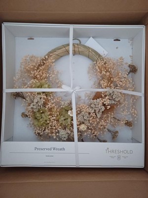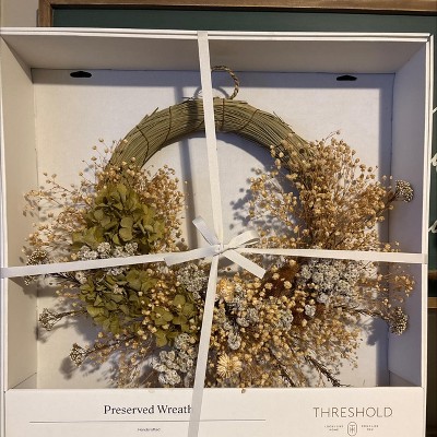 Add an eye-catching seasonal touch to your home with this Asymmetrical Floral Preserved Fall Wreath from Threshold™. Designed in a circular shape, the unlit asymmetrical wreath is adorned with preserved hydrangeas, florals and straws in multiple hues to create a rich autumn color palette that pairs seamlessly with a variety of different decor styles. This ready-to-use wreath is designed for indoor use, and the top loop makes it easy to hang on any wall or door for a welcoming vibe.
