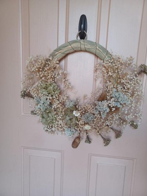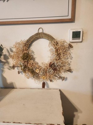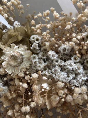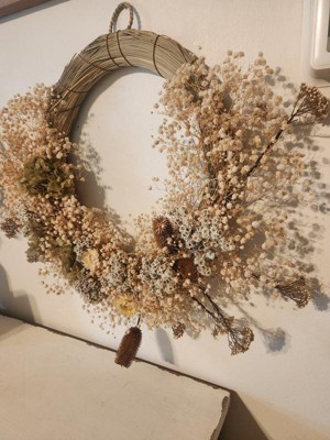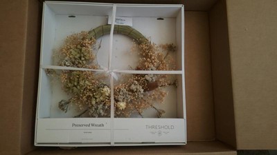 The Asymmetrical Floral Preserved Wreath is nice but it looks like more of a fall decoration. I was careful taking it out of the box as there were lots of bits and pieces floating around. Not sure if it is just the one I received, but it was extremely dry and fragile. Was going to go in my entryway but decided on my office to avoid potential damage from my kids or husband coming inside on a windy day. I had to vacuum up remnants after putting it up and sweep up the path to the recycle bin after disposing of the box. I suggest buying in person and not ordering to ensure "freshness".