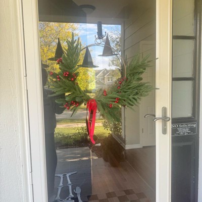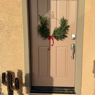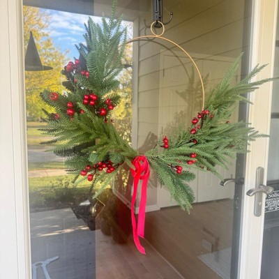 [This review was collected as part of a promotion.] I love this asymmetrical holiday wreath. I am always looking for something that I can add a mixed bow to and use as needed. This is perfect. The velvet bow is kind of skimpy however, you could always add to it or just use as is. Very cute and super easy to hang as it has a metal Gold loop attached to the top. I like the way it fills out the entire door without being overpowering or too bulky to get caught in the winter months weather.