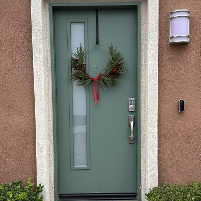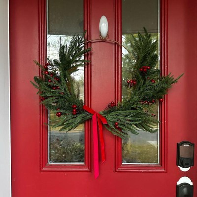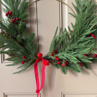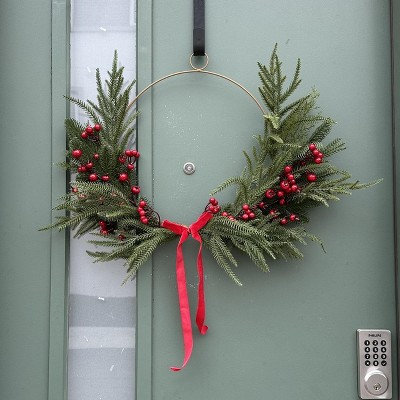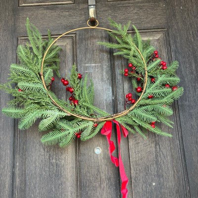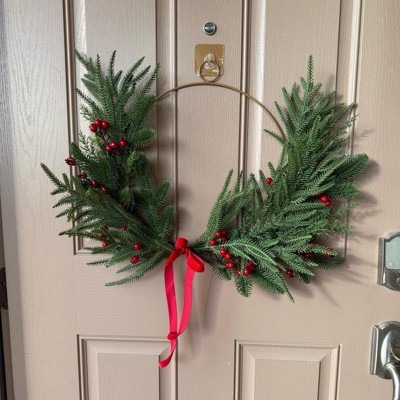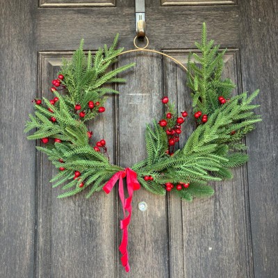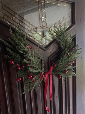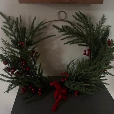 [This review was collected as part of a promotion.] I love this wreath! It combines modern (my aesthetic) with just enough classic style to really express the holiday spirit. I am hanging it on my front door, I love that the wreath frame has a hanger built in. I will say the branches being plastic clearly look fake, which was a little disappointing. The berries and the little ribbon add the nicest touches to bring this wreath all together. Love it! I received an incentive to write this review.