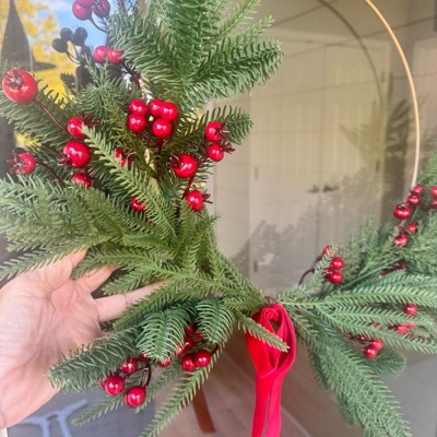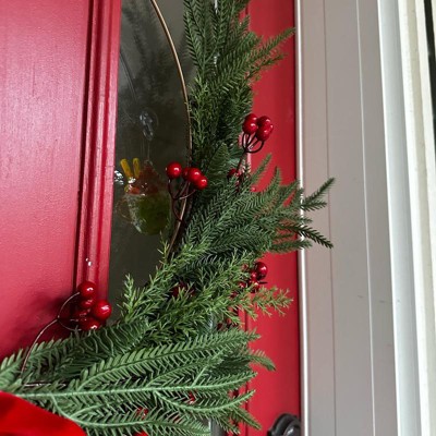 - Features faux pine leaves and red berries