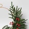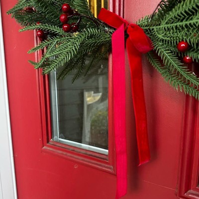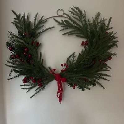 Embrace the holiday spirit with this Asymmetrical Holiday Wreath from Threshold™. This wreath features faux pine needles and red berries for a nature-inspired look and is accented by a red bow for seasonal charm. Designed in a circular shape, you can hang this decorative wreath above the mantel or on any wall for a touch of festive flair.