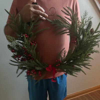 [This review was collected as part of a promotion.] This is the Threshold asymmetrical mixed Christmas wreath. I love the modern look of this wreath. It is thin with just enough greenery. It is actually bigger in person than it looked online at 26 inches wide. I love the red accents. It is the perfect balance. Although it is faux, it does look very authentic in person. I think this wreath would be a great addition year after year. I received an incentive to write this review.