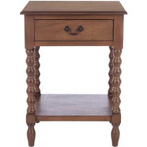 Classic farmhouse charm meets contemporary decor in this Athena Accent Table. Athena's modernized ball turned legs are beautifully highlighted by its rich brown finish, while an open bottom shelf and slim drawer provide ample storage and display space.
