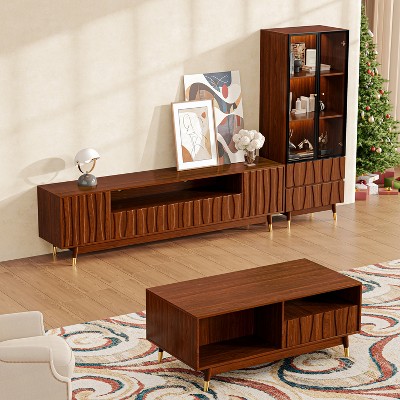 Are you looking for an artistic entertainment center set? Try our 78.7" TV stand and 3-Tier glass display cabinet with drawers : A sophisticated mid-century design with transparent glass doors creates a unique look that adds a touch of elegance to any living space. Elevate your entertainment space with this modern TV stand. With its engineered wood construction, this console features a contemporary silhouette with mid-century modern inspiration with neutral hues and a wood grain finish. Featuring a TV stand and a glass display, each piece is founded atop four slanted legs. Bring a splash of color and lots of elegance to your living room with this mid-century modern entertainment center set that complements any decor style. You can easily sort and store media devices and items of different shapes.