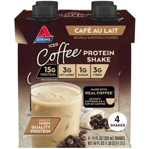 - AT HOME OR ON-THE-GO. Atkins Café au Lait Iced Coffee Protein Shakes. Enjoy delicious shakes that fit right into your Busy schedule, with 15g of protein, 3g of net carbs, and 1g of sugar per serving*. This is Today’s Atkins™.