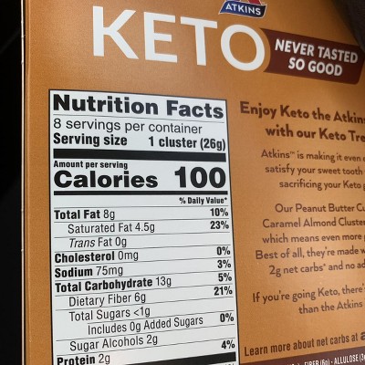 - SATISFY YOUR SWEET TOOTH. Atkins Keto Caramel Almond Clusters. 2g of net carbs and less than 1g of sugar per
