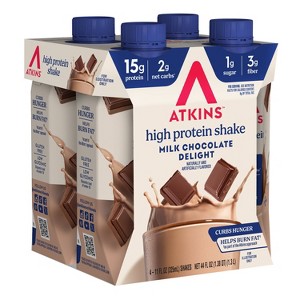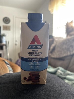 - AT HOME OR ON-THE-GO. Atkins Milk Chocolate Delight Protein Shakes. Enjoy delicious shakes that fit right into yourBusy schedule, with 15g of protein, 2g of net carbs and 1g of sugar per serving*. This is Today’s Atkins™.