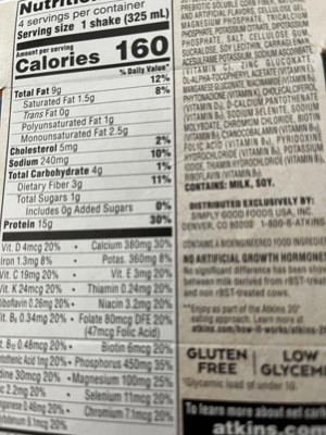 - AT HOME OR ON-THE-GO. Atkins Creamy Vanilla Protein Shakes. Enjoy delicious shakes that fit right into your busy schedule, with 15g of protein, 2g of net carbs and 1g of sugar per serving*. This is Today’s Atkins™.
