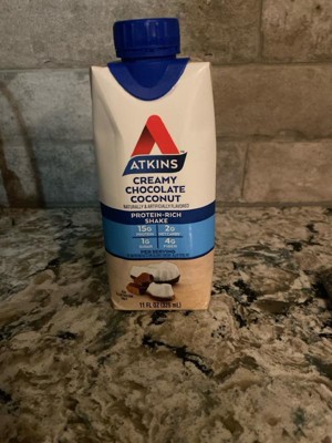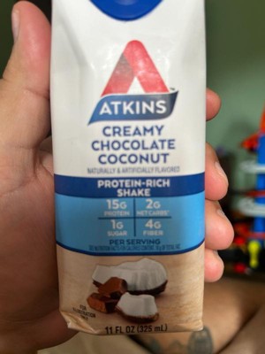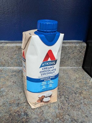 - Available in a pack of four 11 fl oz ready to drink shakes, Atkins Creamy Chocolate Coconut Protein Shakes are an ideal way to indulge whether at home or on the move. So be sure to stock up on these and all your other favorite Atkins products today.