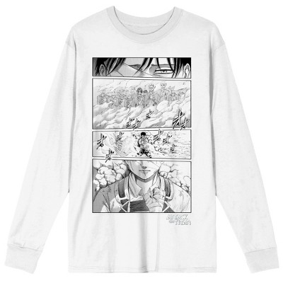 Rep your favorite manga with this officially licensed Attack On Titan men's tee featuring a big bold sketch of a titan eating a human! With long sleeves and a classic crew neck, this bright white t-shirt offers comfort and style that's perfect for all-day, any-day wear. And since it's crafted from high-quality 100% cotton, this tee ensures a soft and comfortable feel. When it's time for cleaning, simply machine wash it cold and tumble dry low for effortless care.