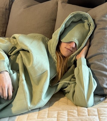 This was a purchase for my teenager. She has a lot of travel for sports and is often cold on the bus. I liked that this was oversized and could be also used with the eye mask. It was a hit! She likes that it keeps her warm without being too bulky. The hoodie has a good weight too it and is perfectly oversized.