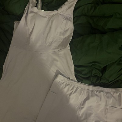 This is such a cute workout dress! The shorts have pockets, I love the detail of the scalloped neck and skirt. It dos run a little big I ordered what I usually do and it was looser than I was expecting not bad just if you want a tight fit you may want to size down.