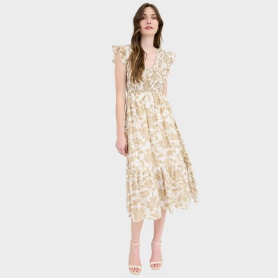 Product Name: August Sky Women's Split Neck Smocked Tiered Floral Midi Dress, Ivory Multi, Small