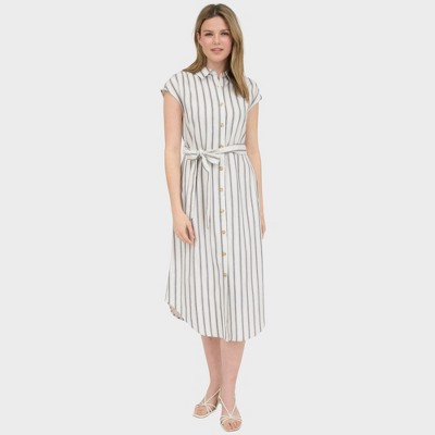 • Long sleeves, faux button down, contrast trim at the neckline, hem, around the waistline, and going down the center of the dress