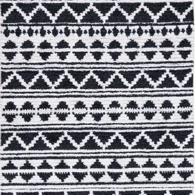 The pattern, as observed from the image, boasts a geometric design with sharp contrasts and symmetrical motifs that create a striking visual interest. This design will resonate with those who appreciate a bold, yet classic aesthetic in their home furnishings. Whether used as a statement piece or a complementary element, this area rug is a sophisticated choice for contemporary and traditional interiors alike.