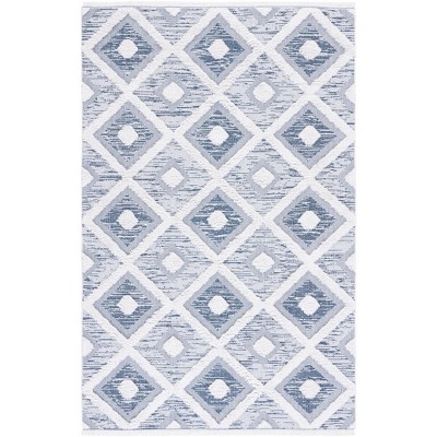 The rug's pattern draws inspiration from cultural designs, showcasing a harmonious blend of geometric shapes and symbols woven in navy blue against a clean ivory background. Its aesthetics speak to both contemporary and traditional tastes, allowing the rug to seamlessly integrate into various interior styles.