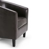 - Features curved back, sides with top stitching detail, dark brown solid wood legs and removable high density foam seat cushion