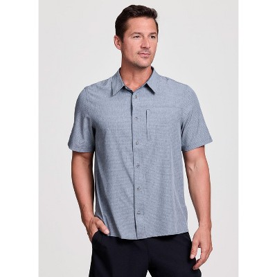 Designed to be an ideal warm weather top with its ultra versatile button-up, collared design and super lightweight and breathable stretch woven fabric that dries quickly and complete with a tonal palm print, this short sleeve button up shirt for men is the perfect top to take on your next outdoor adventure or vacation. Finished with a chest pocket with button closure to provide secure storage for small valuables like keys, ear buds and more.