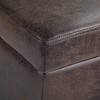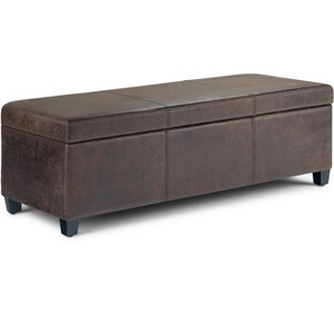 Hand constructed using solid wood, engineered wood and high density foamUpholstered with a durable Distressed Brown Vegan Faux LeatherFeatures large interior storage space with child safety hinge to prevent lid slammingMulti-functional ottoman can be used in bedroom, living room, family room, hallway as an entryway bench, foot stool, accent furniture or provide additional sittingContemporary design includes stitching detailSimple assembly; just attach legsDimensions: 48inW x 18.1inD x 16.1inHEfforts are made to reproduce accurate colors, variations in color may occur due to computer monitor and photography