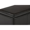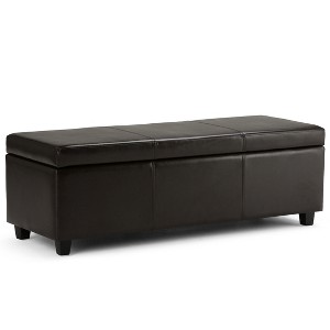 Hand constructed using solid wood, engineered wood and high density foamUpholstered with a durable Tanners Brown Vegan Faux LeatherFeatures large interior storage space with child safety hinge to prevent lid slammingMulti-functional ottoman can be used in bedroom, living room, family room, hallway as an entryway bench, foot stool, accent furniture or provide additional sittingContemporary design includes stitching detailSimple assembly; just attach legsDimensions: 48inW x 18.1inD x 16.1inHEfforts are made to reproduce accurate colors, variations in color may occur due to computer monitor and photography