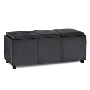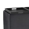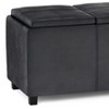 Hand constructed using solid wood, engineered wood and high density foamUpholstered with a durable Distressed Black Vegan Faux LeatherFeatures 3 flip over serving trays and large interior storageMulti-functional ottoman can be used in bedroom, living room, family room, hallway as an entryway bench, foot stool, accent furniture or provide additional sittingContemporary design includes stitching detailAssembly RequiredDimensions: 17in D x 42in W x 17in HEfforts are made to reproduce accurate colors, variations in color may occur due to computer monitor and photography